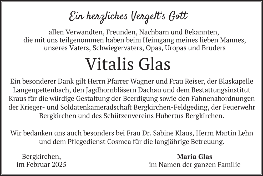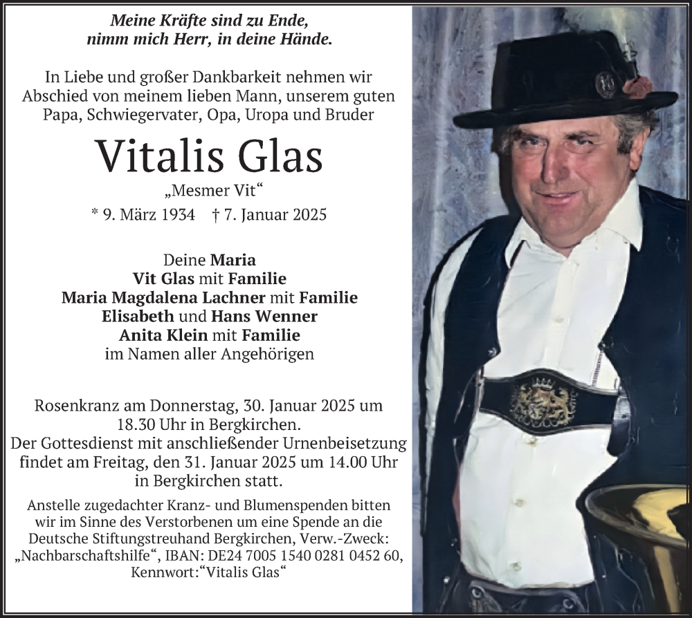Hier finden Sie alle Traueranzeigen aus der Zeitung, die bisher für Vitalis Glas erschienen sind. Weitere Traueranzeigen, die in der Zeitung erscheinen, werden hier ebenfalls aufgelistet