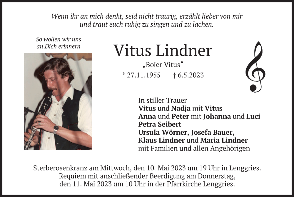 Hier finden Sie alle Traueranzeigen aus der Zeitung, die bisher für Vitus Lindner erschienen sind. Weitere Traueranzeigen, die in der Zeitung erscheinen, werden hier ebenfalls aufgelistet