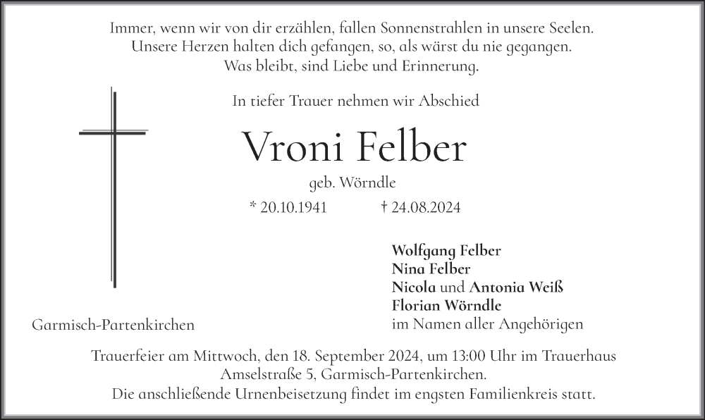 Hier finden Sie alle Traueranzeigen aus der Zeitung, die bisher für Vroni Felber erschienen sind. Weitere Traueranzeigen, die in der Zeitung erscheinen, werden hier ebenfalls aufgelistet
