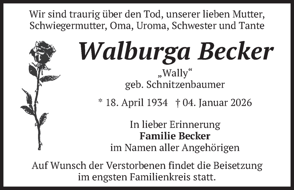 Hier finden Sie alle Traueranzeigen aus der Zeitung, die bisher für Walburga Becker erschienen sind. Weitere Traueranzeigen, die in der Zeitung erscheinen, werden hier ebenfalls aufgelistet