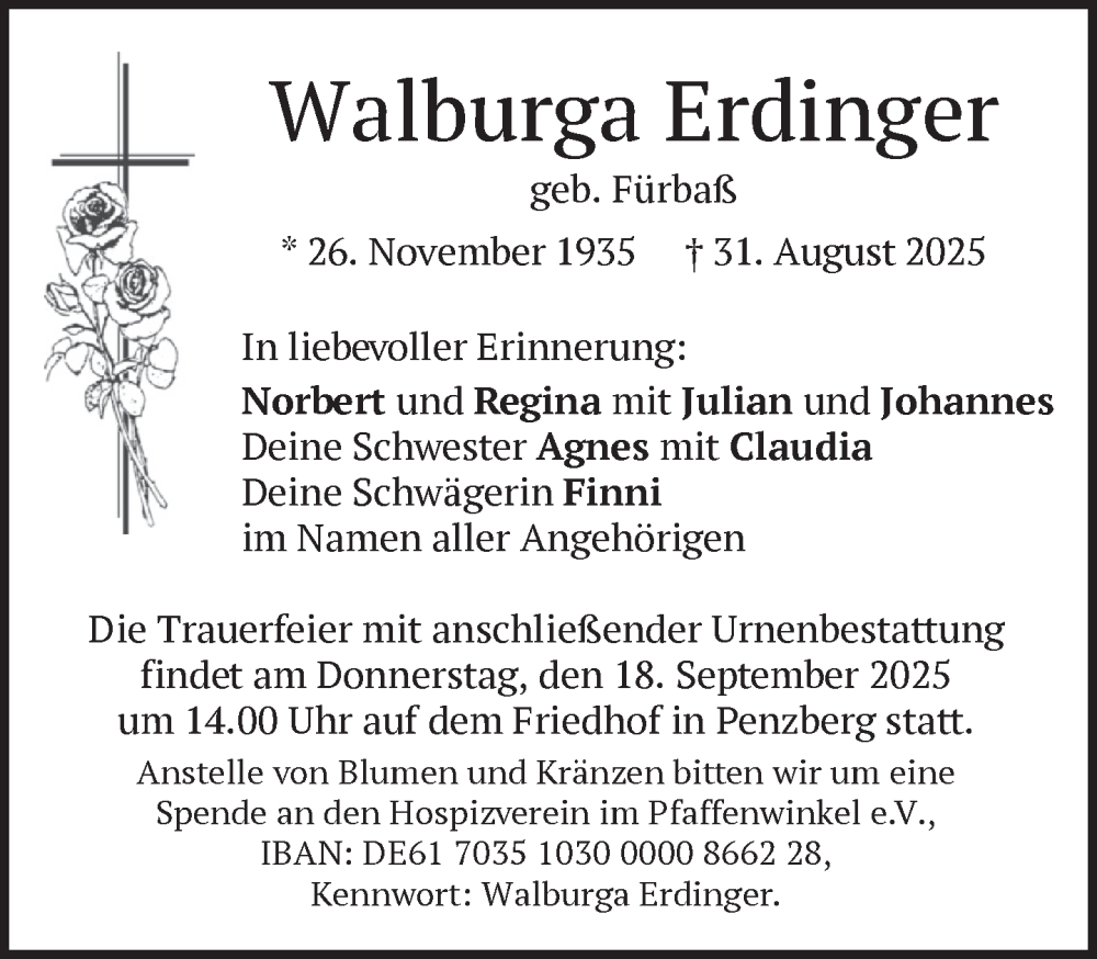 Hier finden Sie alle Traueranzeigen aus der Zeitung, die bisher für Walburga Erdinger erschienen sind. Weitere Traueranzeigen, die in der Zeitung erscheinen, werden hier ebenfalls aufgelistet