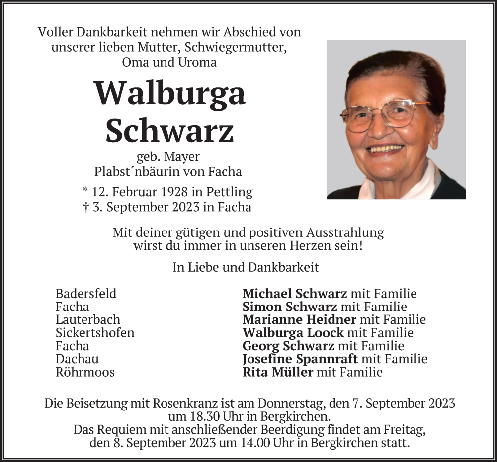 Hier finden Sie alle Traueranzeigen aus der Zeitung, die bisher für Walburga Schwarz erschienen sind. Weitere Traueranzeigen, die in der Zeitung erscheinen, werden hier ebenfalls aufgelistet
