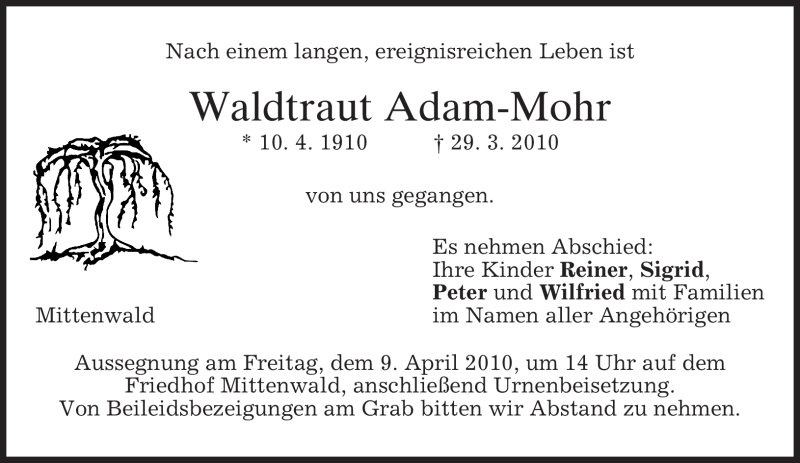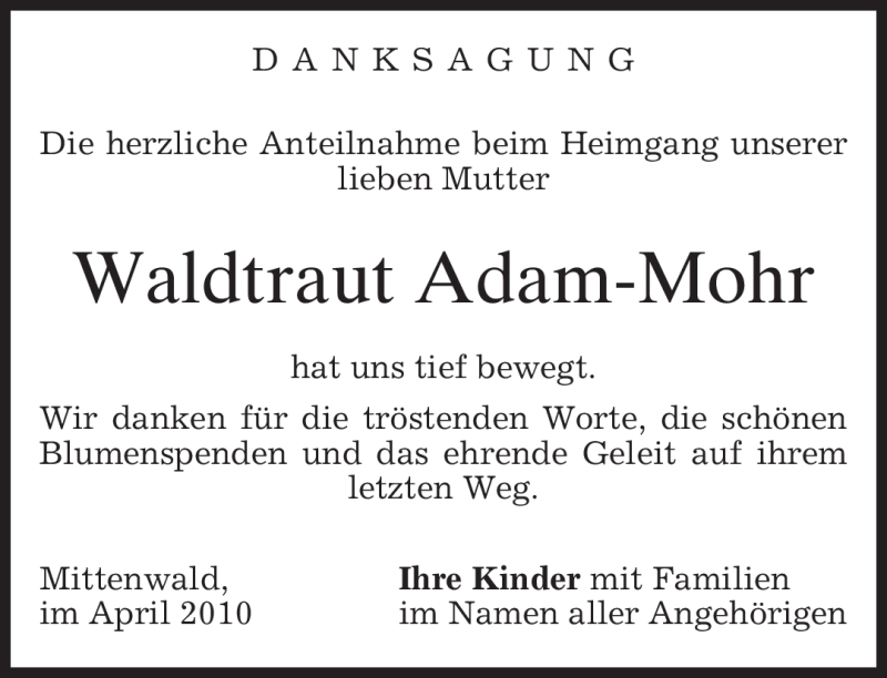 Hier finden Sie alle Traueranzeigen aus der Zeitung, die bisher für Waldtraut Adam-Mohr erschienen sind. Weitere Traueranzeigen, die in der Zeitung erscheinen, werden hier ebenfalls aufgelistet