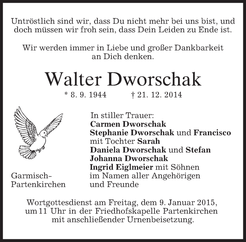 Hier finden Sie alle Traueranzeigen aus der Zeitung, die bisher für Walter Dworschak erschienen sind. Weitere Traueranzeigen, die in der Zeitung erscheinen, werden hier ebenfalls aufgelistet