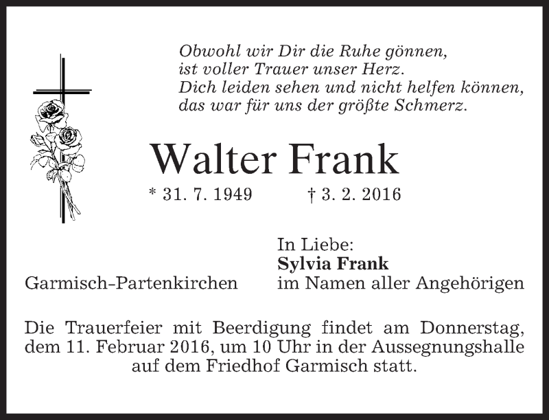 Hier finden Sie alle Traueranzeigen aus der Zeitung, die bisher für Walter Frank erschienen sind. Weitere Traueranzeigen, die in der Zeitung erscheinen, werden hier ebenfalls aufgelistet