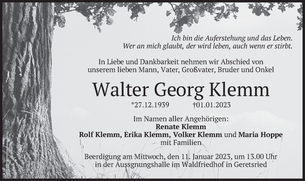 Hier finden Sie alle Traueranzeigen aus der Zeitung, die bisher für Walter Georg Klemm erschienen sind. Weitere Traueranzeigen, die in der Zeitung erscheinen, werden hier ebenfalls aufgelistet