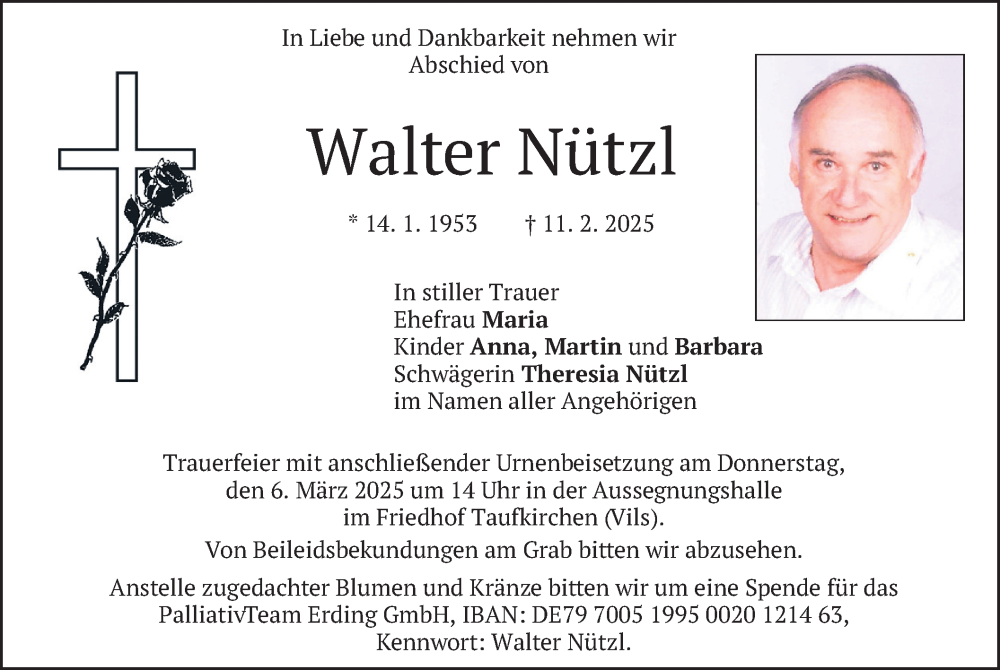 Hier finden Sie alle Traueranzeigen aus der Zeitung, die bisher für Walter Nützl erschienen sind. Weitere Traueranzeigen, die in der Zeitung erscheinen, werden hier ebenfalls aufgelistet