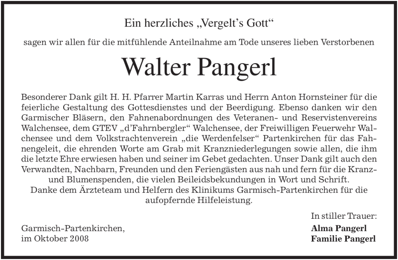 Hier finden Sie alle Traueranzeigen aus der Zeitung, die bisher für Walter Pangerl erschienen sind. Weitere Traueranzeigen, die in der Zeitung erscheinen, werden hier ebenfalls aufgelistet
