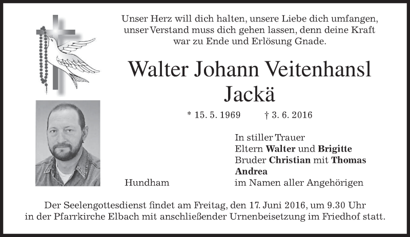 Hier finden Sie alle Traueranzeigen aus der Zeitung, die bisher für Walter Johann Veitenhansl Jackä erschienen sind. Weitere Traueranzeigen, die in der Zeitung erscheinen, werden hier ebenfalls aufgelistet