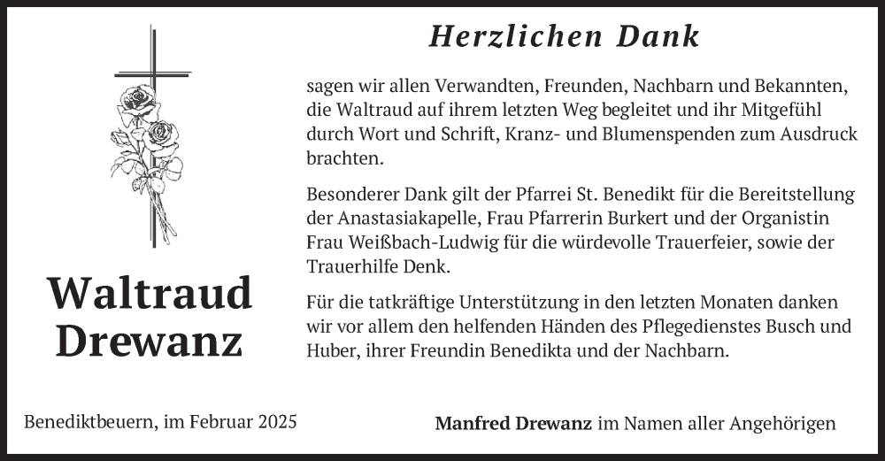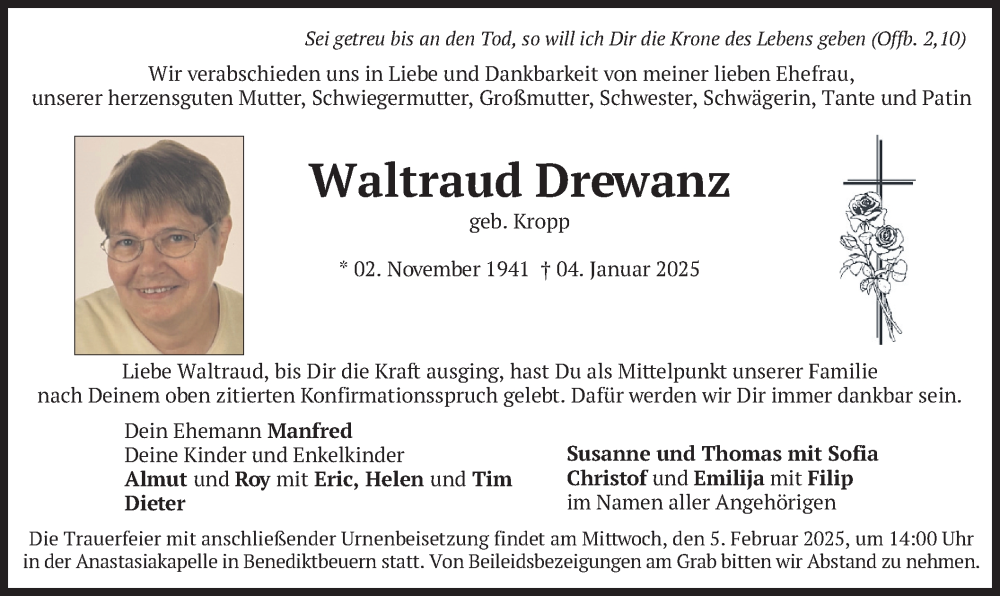 Hier finden Sie alle Traueranzeigen aus der Zeitung, die bisher für Waltraud Drewanz erschienen sind. Weitere Traueranzeigen, die in der Zeitung erscheinen, werden hier ebenfalls aufgelistet