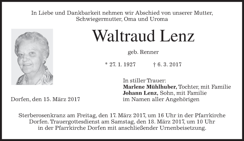 Hier finden Sie alle Traueranzeigen aus der Zeitung, die bisher für Waltraud Lenz erschienen sind. Weitere Traueranzeigen, die in der Zeitung erscheinen, werden hier ebenfalls aufgelistet