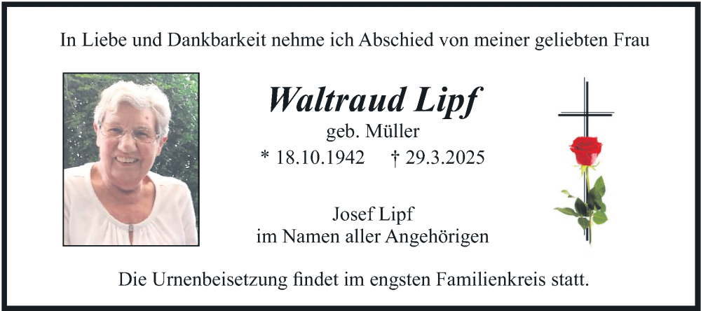 Hier finden Sie alle Traueranzeigen aus der Zeitung, die bisher für Waltraud Lipf erschienen sind. Weitere Traueranzeigen, die in der Zeitung erscheinen, werden hier ebenfalls aufgelistet