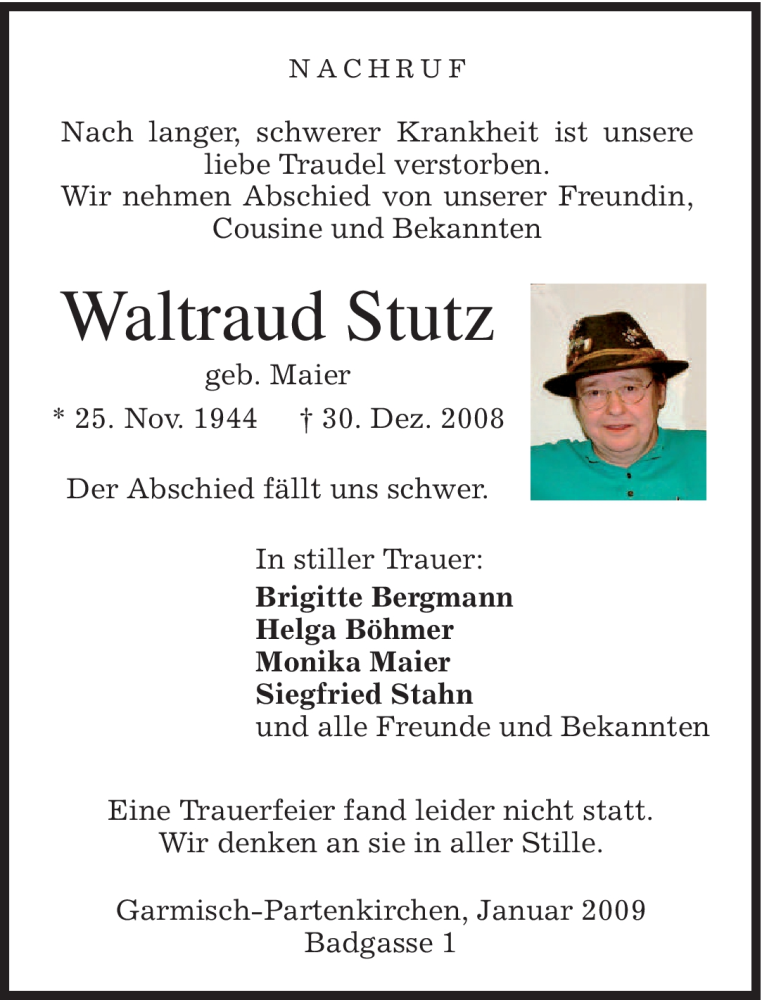 Hier finden Sie alle Traueranzeigen aus der Zeitung, die bisher für Waltraud Stutz erschienen sind. Weitere Traueranzeigen, die in der Zeitung erscheinen, werden hier ebenfalls aufgelistet