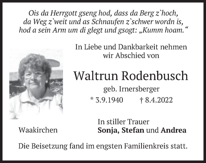 Hier finden Sie alle Traueranzeigen aus der Zeitung, die bisher für Waltrun Rodenbusch erschienen sind. Weitere Traueranzeigen, die in der Zeitung erscheinen, werden hier ebenfalls aufgelistet