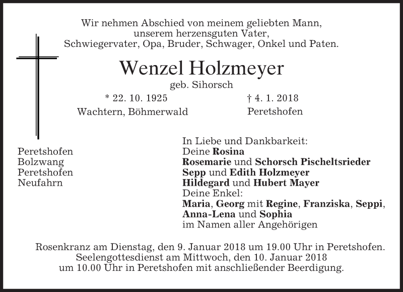 Hier finden Sie alle Traueranzeigen aus der Zeitung, die bisher für Wenzel Holzmeyer erschienen sind. Weitere Traueranzeigen, die in der Zeitung erscheinen, werden hier ebenfalls aufgelistet