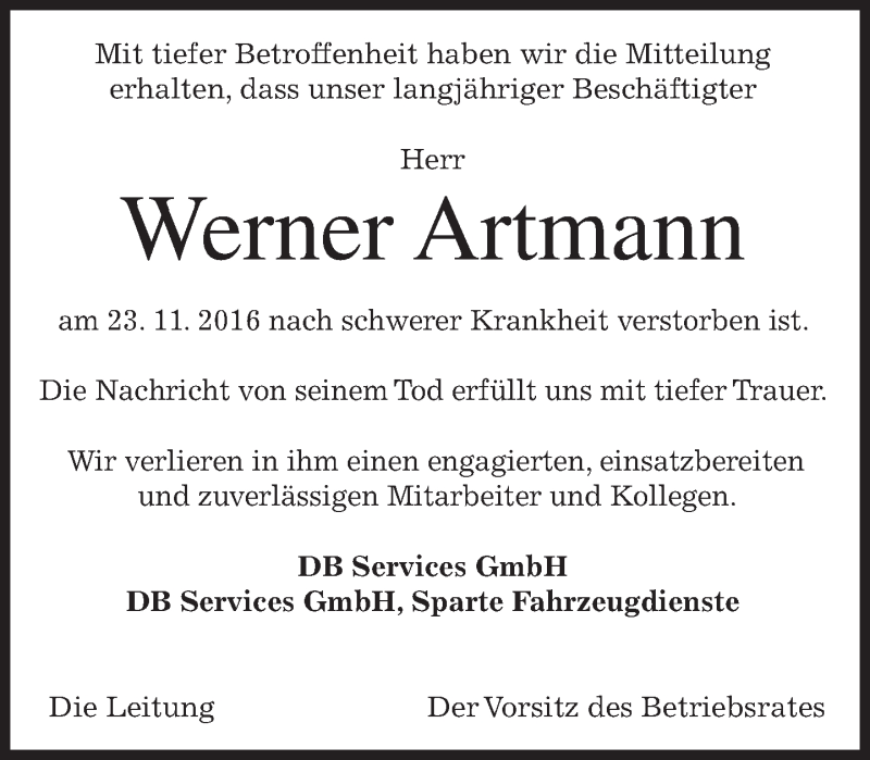 Hier finden Sie alle Traueranzeigen aus der Zeitung, die bisher für Werner Artmann erschienen sind. Weitere Traueranzeigen, die in der Zeitung erscheinen, werden hier ebenfalls aufgelistet