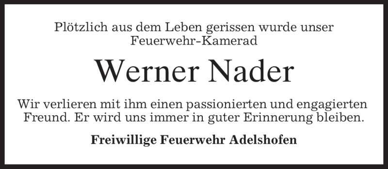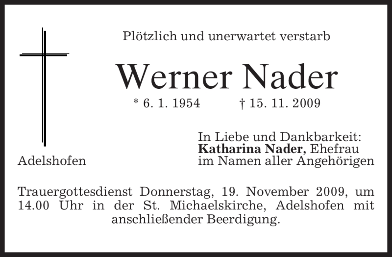 Hier finden Sie alle Traueranzeigen aus der Zeitung, die bisher für Werner Nader erschienen sind. Weitere Traueranzeigen, die in der Zeitung erscheinen, werden hier ebenfalls aufgelistet