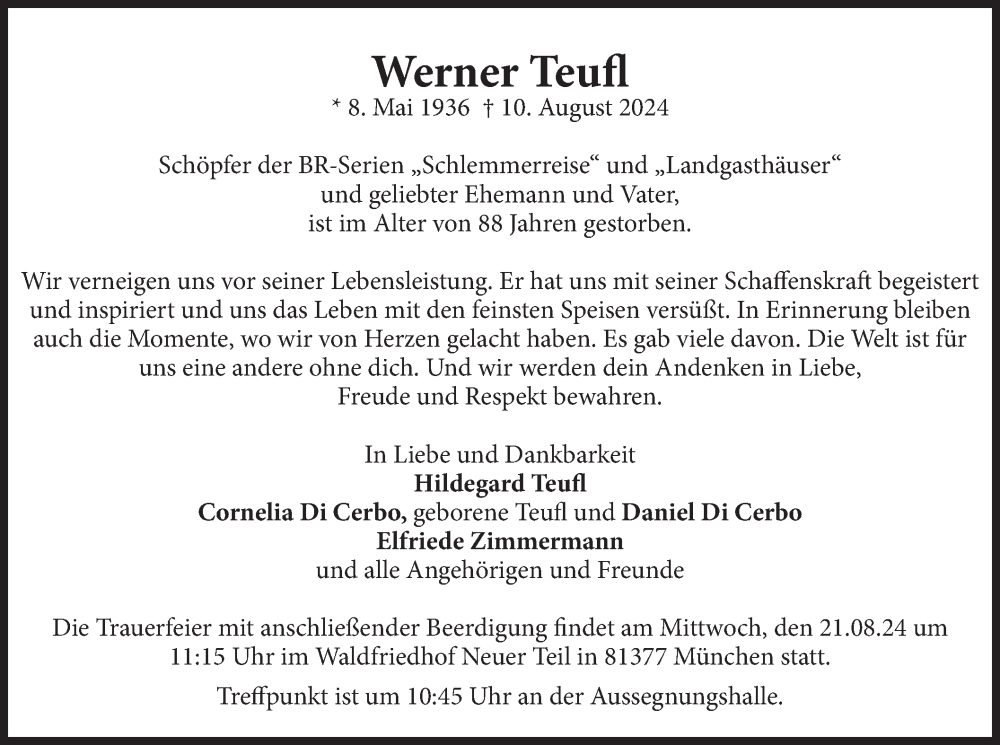 Hier finden Sie alle Traueranzeigen aus der Zeitung, die bisher für Werner Teufl erschienen sind. Weitere Traueranzeigen, die in der Zeitung erscheinen, werden hier ebenfalls aufgelistet