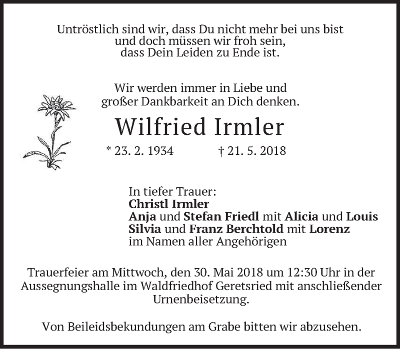 Hier finden Sie alle Traueranzeigen aus der Zeitung, die bisher für Wilfried Irmler erschienen sind. Weitere Traueranzeigen, die in der Zeitung erscheinen, werden hier ebenfalls aufgelistet