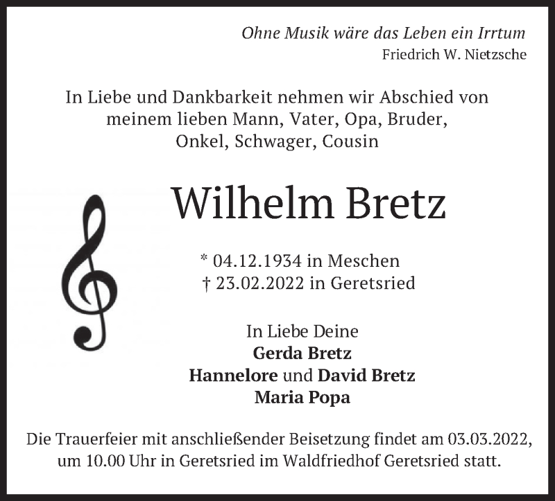Hier finden Sie alle Traueranzeigen aus der Zeitung, die bisher für Wilhelm Bretz erschienen sind. Weitere Traueranzeigen, die in der Zeitung erscheinen, werden hier ebenfalls aufgelistet