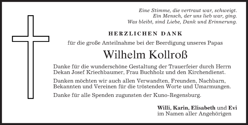 Hier finden Sie alle Traueranzeigen aus der Zeitung, die bisher für Wilhelm Kollroß erschienen sind. Weitere Traueranzeigen, die in der Zeitung erscheinen, werden hier ebenfalls aufgelistet