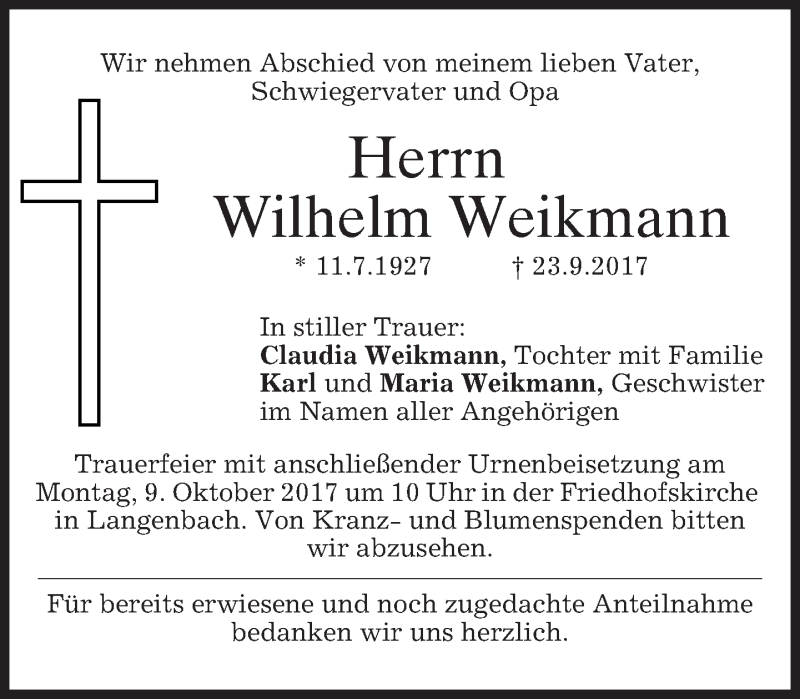 Hier finden Sie alle Traueranzeigen aus der Zeitung, die bisher für Wilhelm Weikmann erschienen sind. Weitere Traueranzeigen, die in der Zeitung erscheinen, werden hier ebenfalls aufgelistet