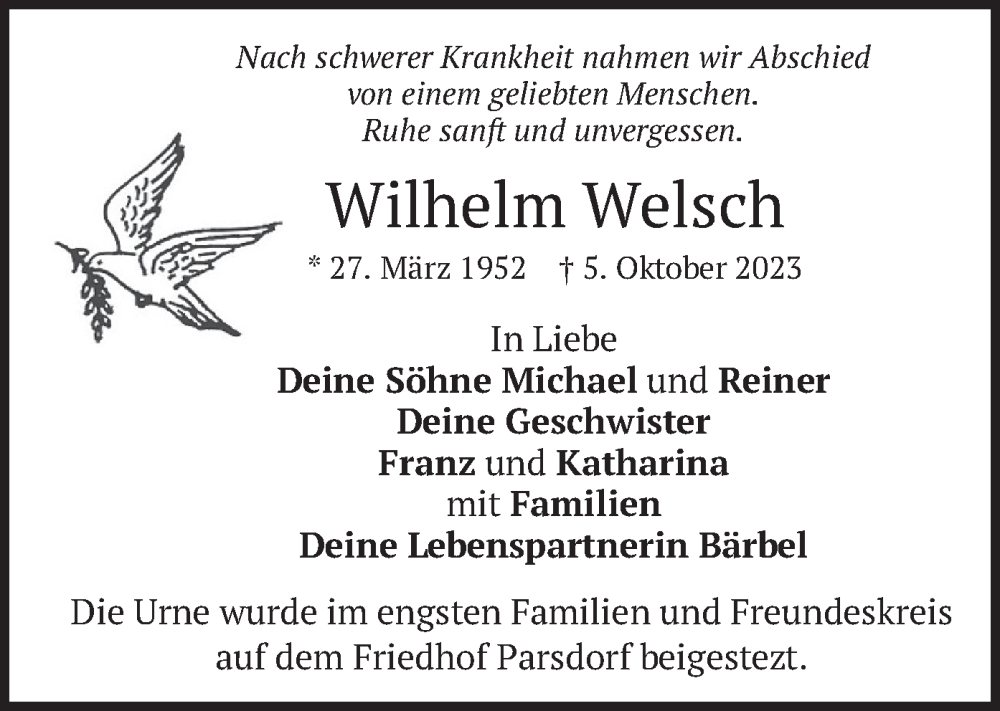 Hier finden Sie alle Traueranzeigen aus der Zeitung, die bisher für Wilhelm Welsch erschienen sind. Weitere Traueranzeigen, die in der Zeitung erscheinen, werden hier ebenfalls aufgelistet