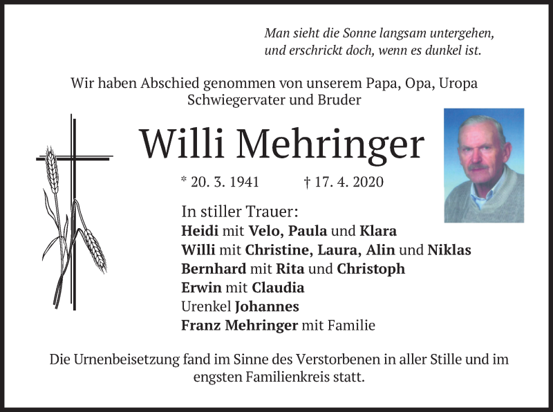 Hier finden Sie alle Traueranzeigen aus der Zeitung, die bisher für Willi Mehringer erschienen sind. Weitere Traueranzeigen, die in der Zeitung erscheinen, werden hier ebenfalls aufgelistet
