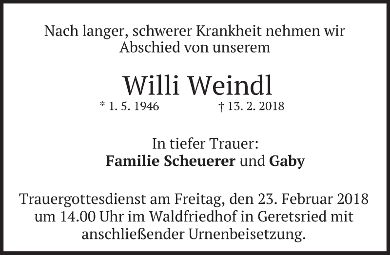 Hier finden Sie alle Traueranzeigen aus der Zeitung, die bisher für Willi Weindl erschienen sind. Weitere Traueranzeigen, die in der Zeitung erscheinen, werden hier ebenfalls aufgelistet
