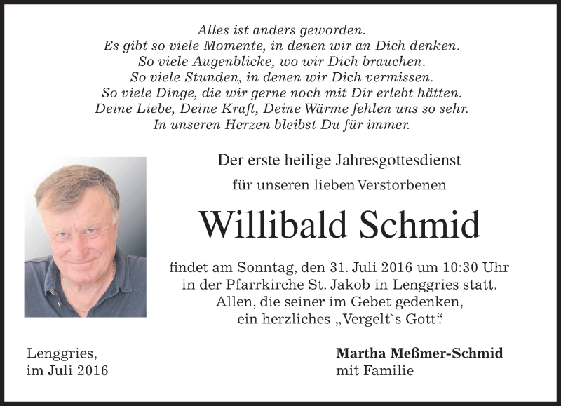 Hier finden Sie alle Traueranzeigen aus der Zeitung, die bisher für Willibald Schmid erschienen sind. Weitere Traueranzeigen, die in der Zeitung erscheinen, werden hier ebenfalls aufgelistet