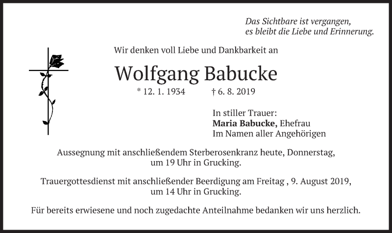 Hier finden Sie alle Traueranzeigen aus der Zeitung, die bisher für Wolfgang Babucke erschienen sind. Weitere Traueranzeigen, die in der Zeitung erscheinen, werden hier ebenfalls aufgelistet