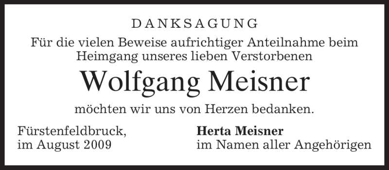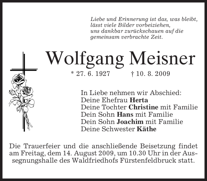 Hier finden Sie alle Traueranzeigen aus der Zeitung, die bisher für Wolfgang Meisner erschienen sind. Weitere Traueranzeigen, die in der Zeitung erscheinen, werden hier ebenfalls aufgelistet