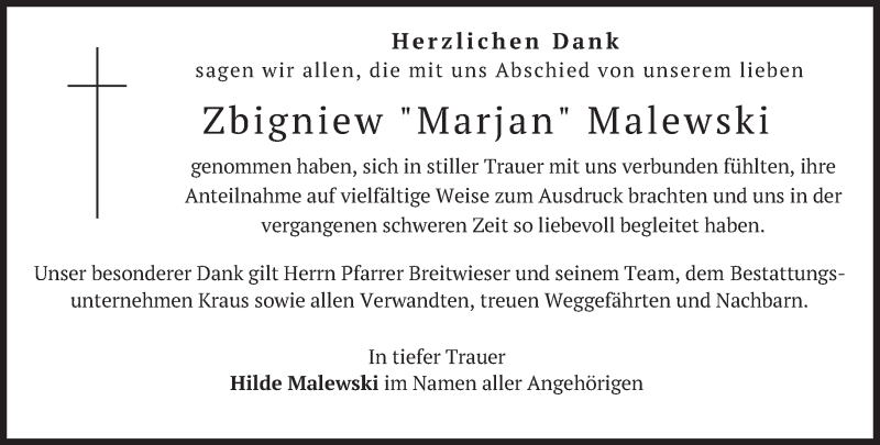 Hier finden Sie alle Traueranzeigen aus der Zeitung, die bisher für Zbigniew Malewski erschienen sind. Weitere Traueranzeigen, die in der Zeitung erscheinen, werden hier ebenfalls aufgelistet