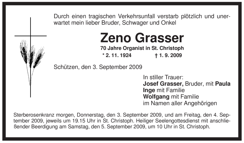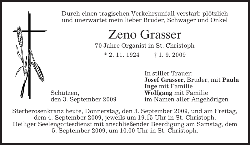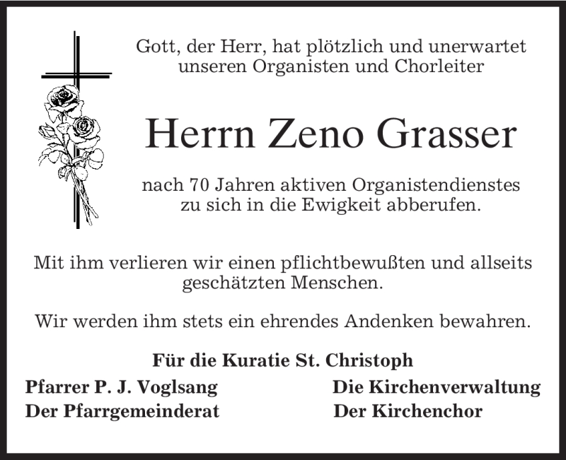 Hier finden Sie alle Traueranzeigen aus der Zeitung, die bisher für Zeno Grasser erschienen sind. Weitere Traueranzeigen, die in der Zeitung erscheinen, werden hier ebenfalls aufgelistet