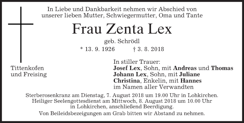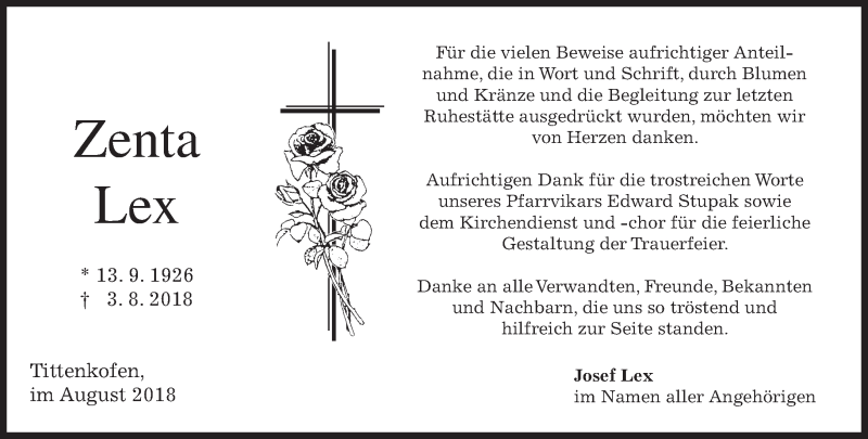 Hier finden Sie alle Traueranzeigen aus der Zeitung, die bisher für Zenta Lex erschienen sind. Weitere Traueranzeigen, die in der Zeitung erscheinen, werden hier ebenfalls aufgelistet
