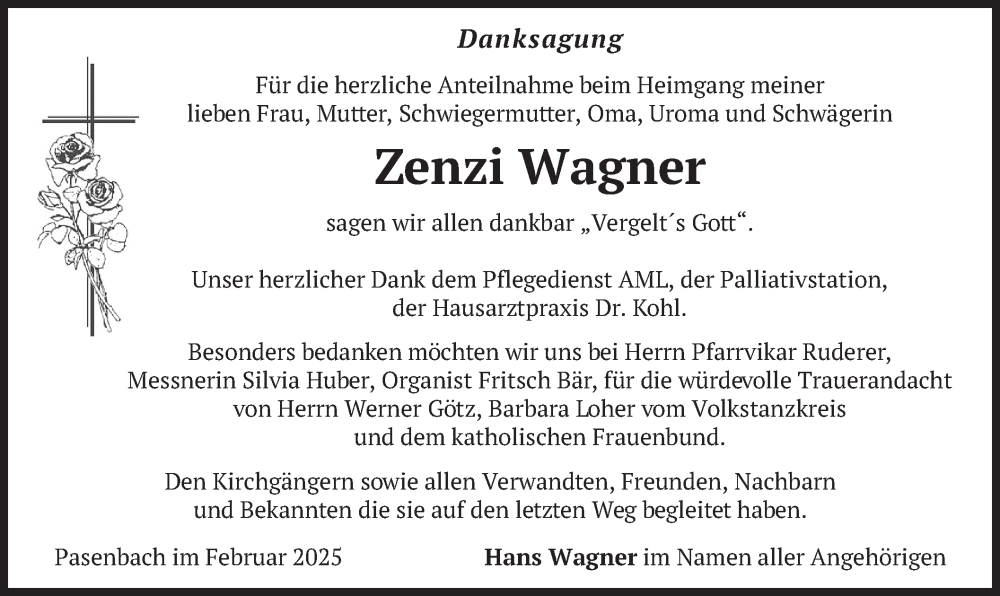 Hier finden Sie alle Traueranzeigen aus der Zeitung, die bisher für Zenzi Wagner erschienen sind. Weitere Traueranzeigen, die in der Zeitung erscheinen, werden hier ebenfalls aufgelistet